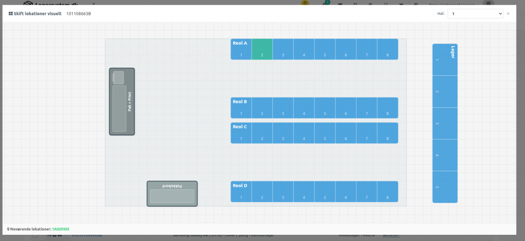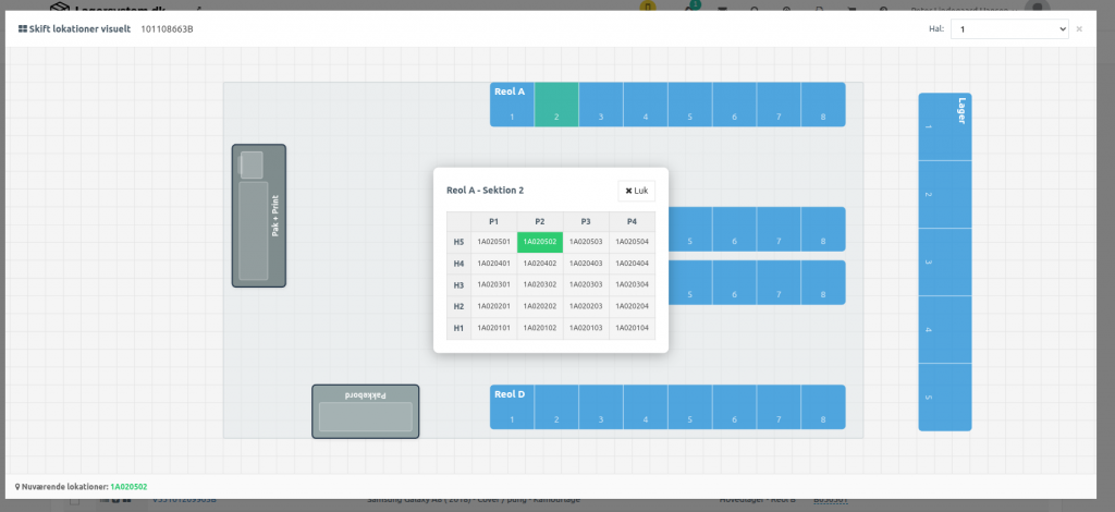 Skift lokationer visuelt er en funktion, der giver jer mulighed for at tilføje og fjerne lokationer direkte via en visuel præsentation af jeres lagerlayout. I stedet for at indtaste lokationskoder manuelt, kan I se hele lagerhallen, og klikke på den relevante sektion i en reol, og derefter vælge den præcise hylde og plads i et overskueligt gitter.